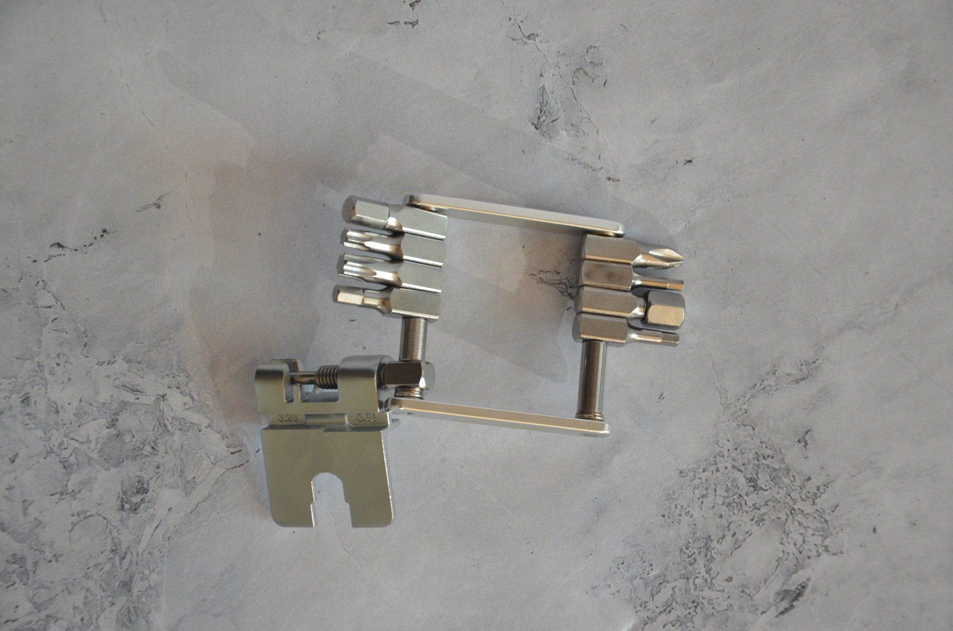 1. CRV Hex Bit 2.5mm/3mm/4mm/5mm/6mm/8mm /T25/T30/PH22. Spoke Wrenches :3.23/3.3/3.45/3.963. M6 Screw Bolt4. Open Wrenches : 8/10mm / Chain Breaker*.Size : 51.2x53mm Weight : 87g